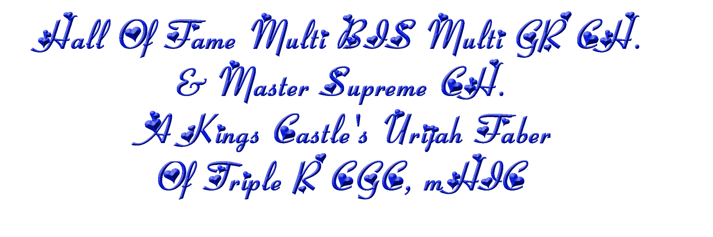 | CERF Clear OFA PRELIMINARY-EXCELLENT MDR1-NORMAL/NORMAL PRA/prcd-NORMAL/CLEAR HC-NORMAL/NORMAL Int'l NAKC/Rarities Champion MASCA Champion NAMASCUSA Champion IMASC Champion Best Of Breed Winner 16 1/2"s |